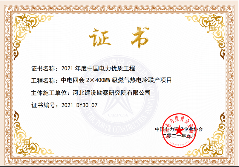 近日,中国电力建设企业协会公布了2021年度中国电力优质工程评审结果,我公司作为中电四会2×400MW级燃气热电冷联产项目主体施工单位,荣获2021年度中国电力行业优质工程奖。